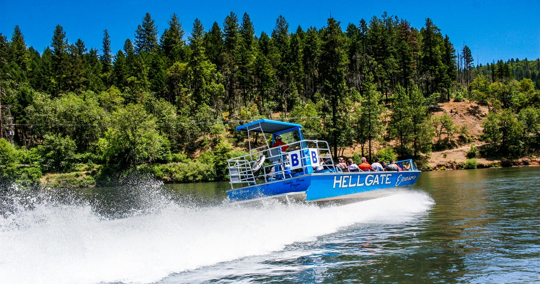 It’s jet boat fun for everyone! Get on-board our 1-hour, 14-mile River Run Excursion! Take in the sights and sounds of nature as you glide inches above the water, and enjoy 360° spins on your way down to the mouth of the Applegate Confluence and back to Grants Pass.